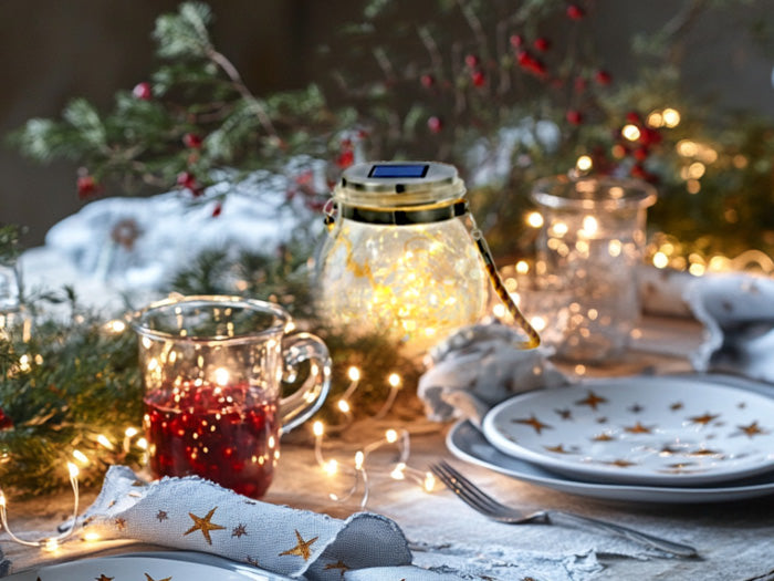 Add a rustic charm to your Christmas table with solar lantern jars. They’re an enchanting and sustainable choice, giving off a cozy glow while adding a touch of whimsy to your centerpiece. Position them for maximum sunlight during the day, so they shine all evening.